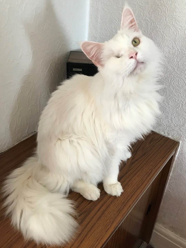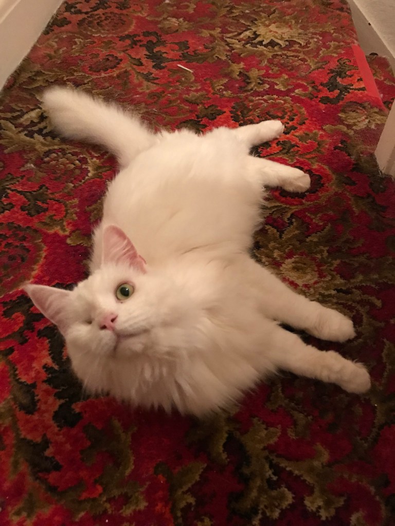 His lovely long, wavy white fur was so silky to the touch. He was a little bit shy at first somehow squeezing his large frame inside a comparatively small hiding space. When he came out, however, it didn’t take long for his super friendly nature to shine through.
