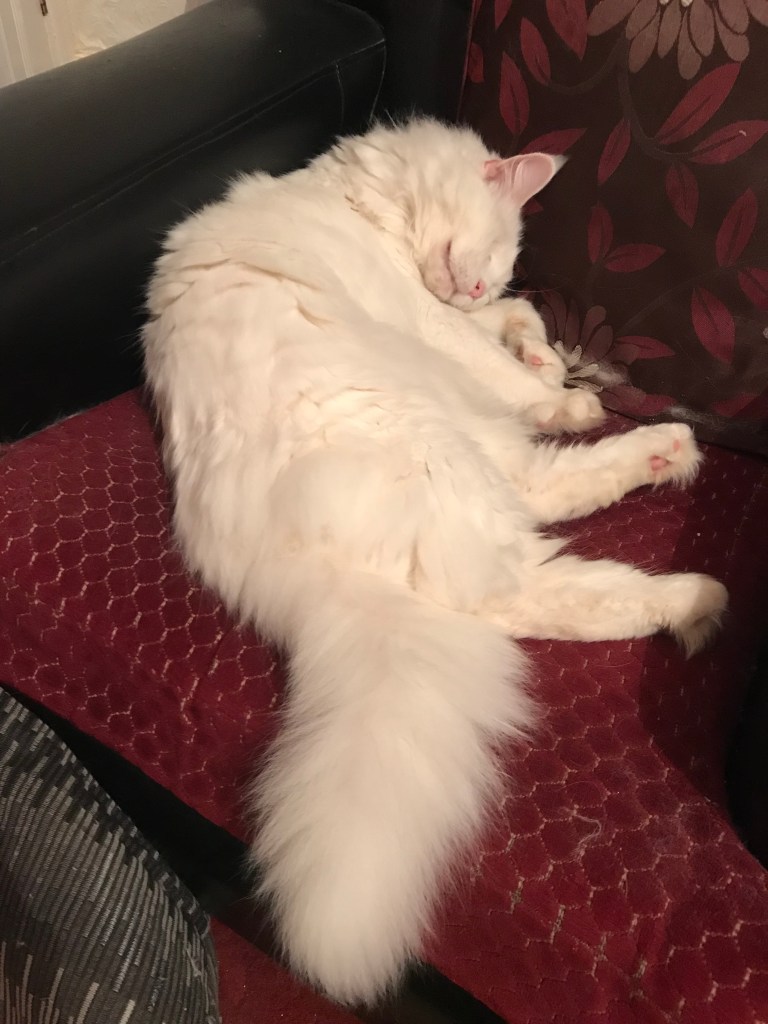 He loves to try and catch a Dreamie in his curled up paw if he can when I throw one to him. Occasionally it gets stuck in the long fur on his foot pad and he frantically spins round in circles trying to get it out! On a night when I’m reading a newspaper or magazine he likes nothing better than jumping on my knee to have a nap using my reading material as his cushion. Oh well I can watch TV instead as luckily the remotes on the chair arm – as I would hate to disturb him.