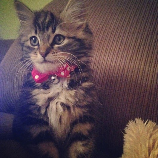 I wanted my cat though, and within a week of finally moving into my own home in December 2014 I was picking up my Maine Coon kitten; Dolly and straight away, that little pink spotty collar was around her neck!